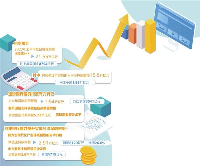 今年上半年以來(lái),金融持續(xù)支持實(shí)體經(jīng)濟(jì)恢復(fù)發(fā)展和回升向好,金融體系對(duì)實(shí)體經(jīng)濟(jì)的支持進(jìn)一步加大。初步統(tǒng)計(jì),2023年上半年社會(huì)融資規(guī)模增量累計(jì)為21.55萬(wàn)億元,比上年同期多4754億元。其中,對(duì)實(shí)體經(jīng)濟(jì)發(fā)放的人民幣貸款增加15.6萬(wàn)億元,同比多增1.99萬(wàn)億元。