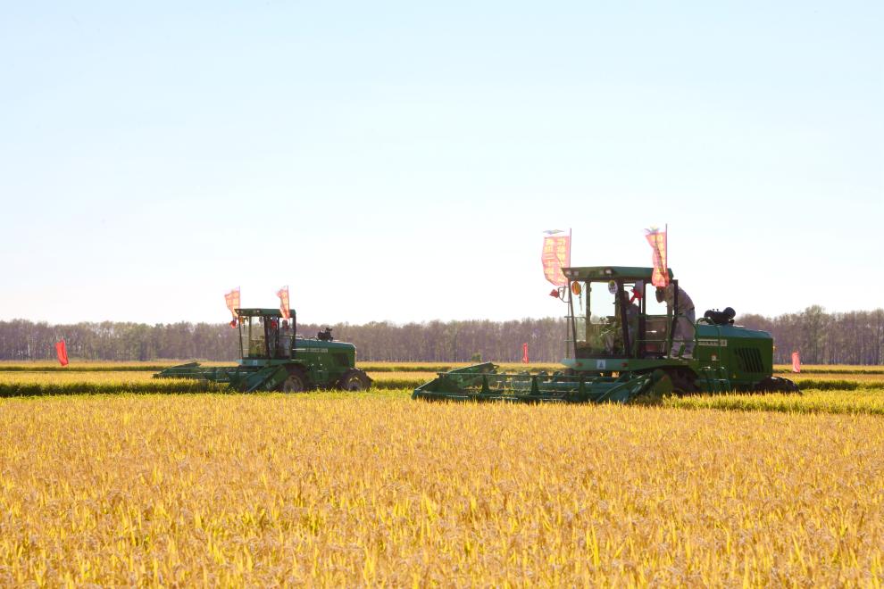 金秋九月,北大荒千里沃野一片金黃。在北大荒集團軍川農(nóng)場有限公司福源管理區(qū)水稻地塊,一臺臺收割機、割曬機正在進行收獲作業(yè)。種植戶楊明成在農(nóng)技人員的指導下率先開鐮,采取直收和割曬拾禾相結合的方式進行收獲。