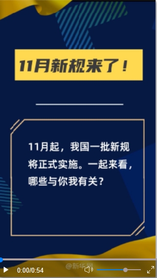 11月起,一批新規(guī)將正式實施。一起來看,哪些與你我有關(guān)?(文字來源:新華社 視頻剪輯:盧俊宇 終審:陳競超)
