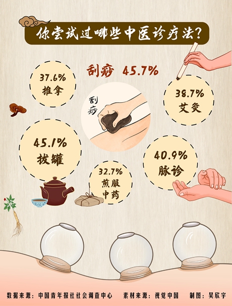 刮痧、拔罐、脈診是受訪青年最常體驗(yàn)的中醫(yī)養(yǎng)生項(xiàng)目
