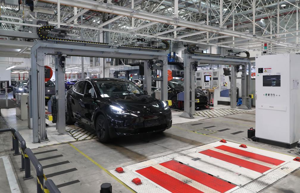 12月22日,在特斯拉上海超級(jí)工廠內(nèi),一輛特斯拉電動(dòng)汽車在進(jìn)行出廠前的車載電子設(shè)備檢測(cè)。新華社記者方喆 攝