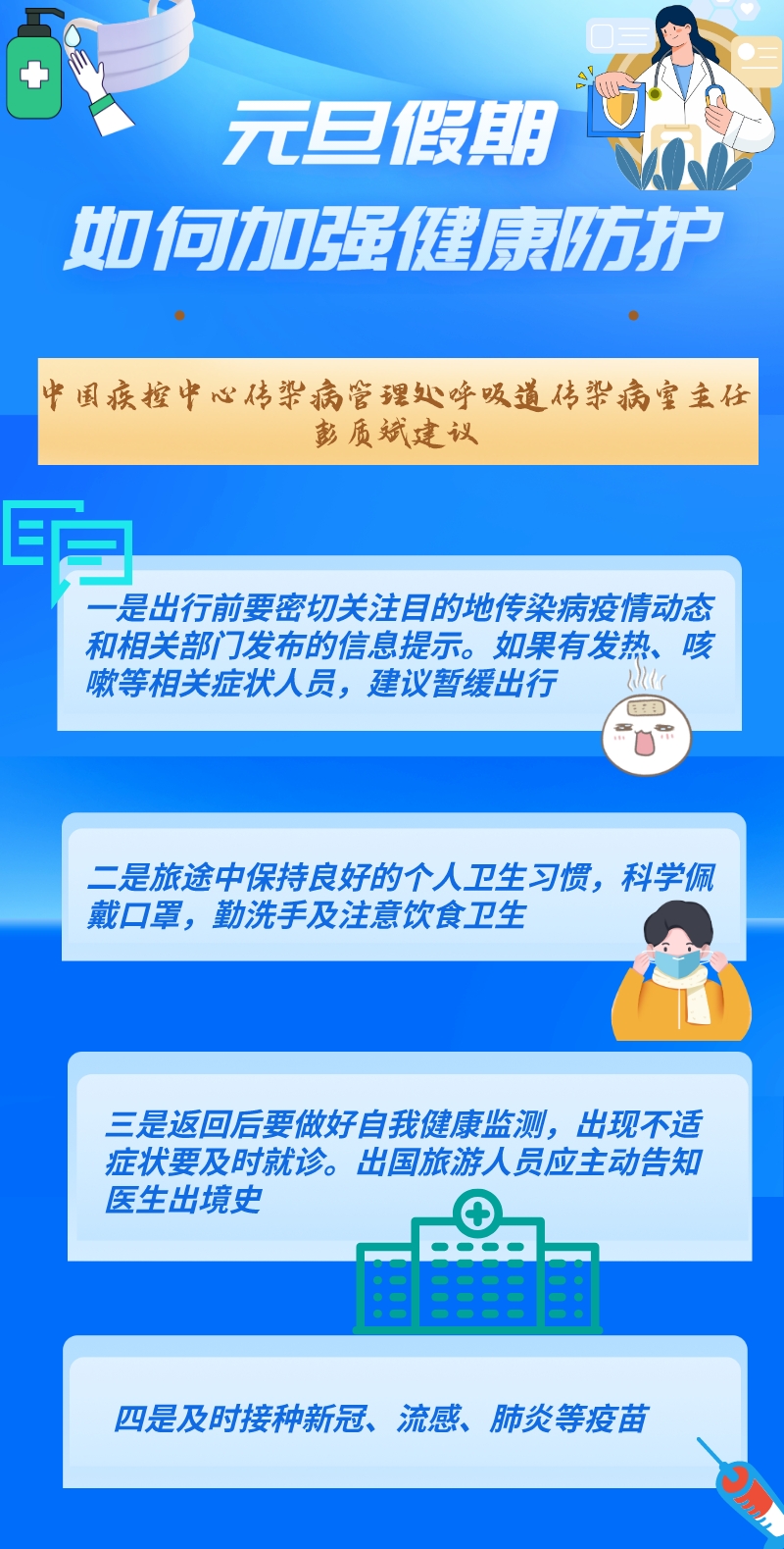 元旦假期中,人員流動增多,探親訪友、旅游出行、聚會聚餐等增加,呼吸道疾病傳播風(fēng)險加大,做好健康防護至關(guān)重要。