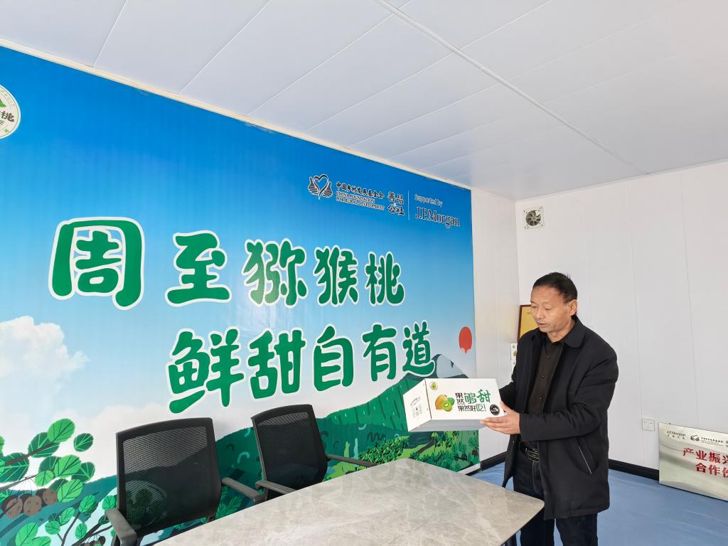 周至縣樓觀鎮(zhèn)西樓村黨支部書(shū)記楊有民向客商介紹獼猴桃新包裝。新華社記者張斌 攝