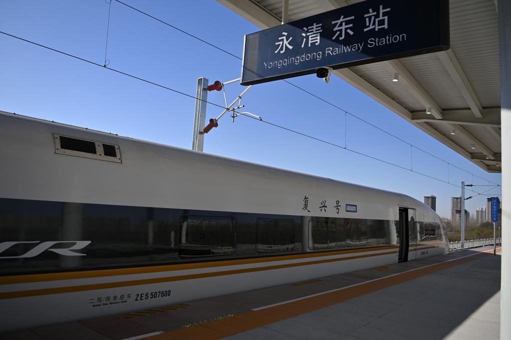一輛復(fù)興號(hào)動(dòng)車組列車停靠在津興城際鐵路永清東站。新華社記者 李然 攝
